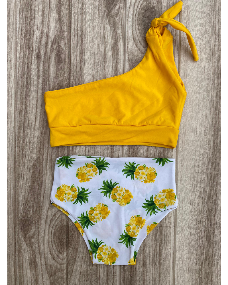 Top amarillo sin relleno, 1 hombro , ajustable y con pretina + calzón vintage (tiro alto). Con costuras invisibles y doble tela lo que no se marca y contiene muy bien.